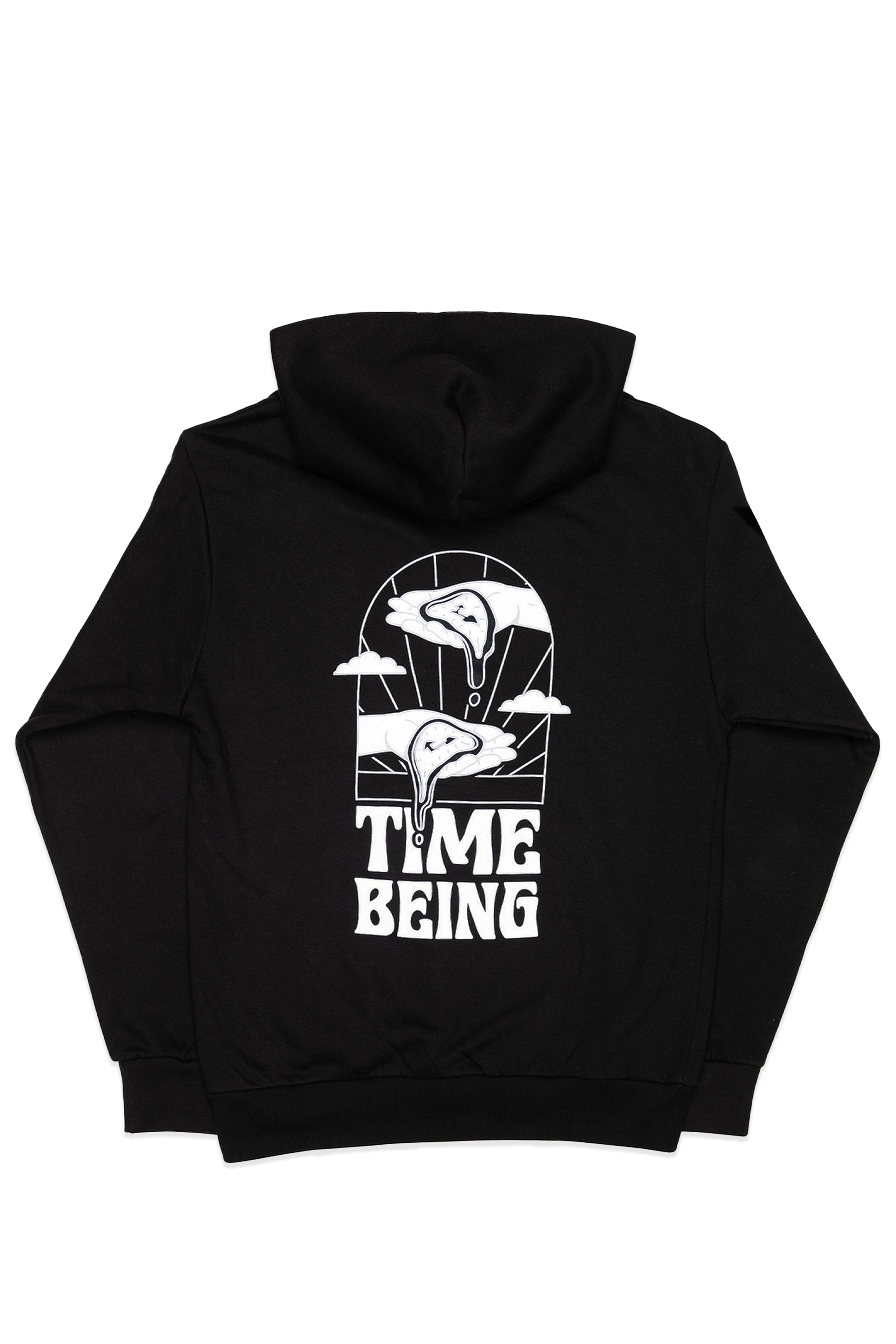 Unisex black hooded sweatshirt with "WHAT'S THE RUSH?" embroidery and melting clock printed graphic